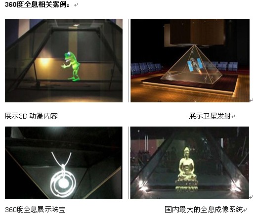 深圳時(shí)代中視科技發(fā)展有限公司 360度全息幻影成像系統(tǒng)360全息也稱360度全息和360度全息成像,我們?cè)谶@里稱它為360度全息成像。360全息成像也被稱之為三維全息影像、全息三維成像,它是由透明材料制成的四面錐體,觀眾的視線能從任何一面穿透它,通過(guò)表面鏡射和反射,觀眾能從錐形空間里看到自由飄浮的影像和圖形。四個(gè)視頻發(fā)射器將光信號(hào)發(fā)射到這個(gè)錐體中的特殊棱鏡上,匯集到一起后形成具有真實(shí)維度空間的立體影像。
